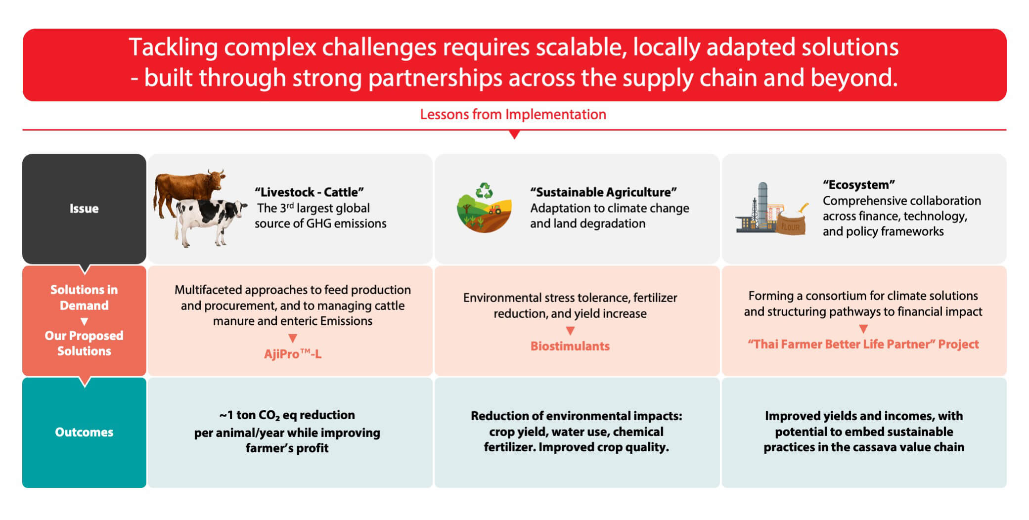 The Ajinomoto Group is committed to leveraging our strengths in "AminoScience" to address climate change, soil degradation, and other complex issues. We also aim to build scalable solutions rooted on site through strong collaboration throughout the supply chain and with diverse partners.